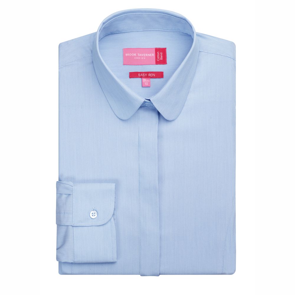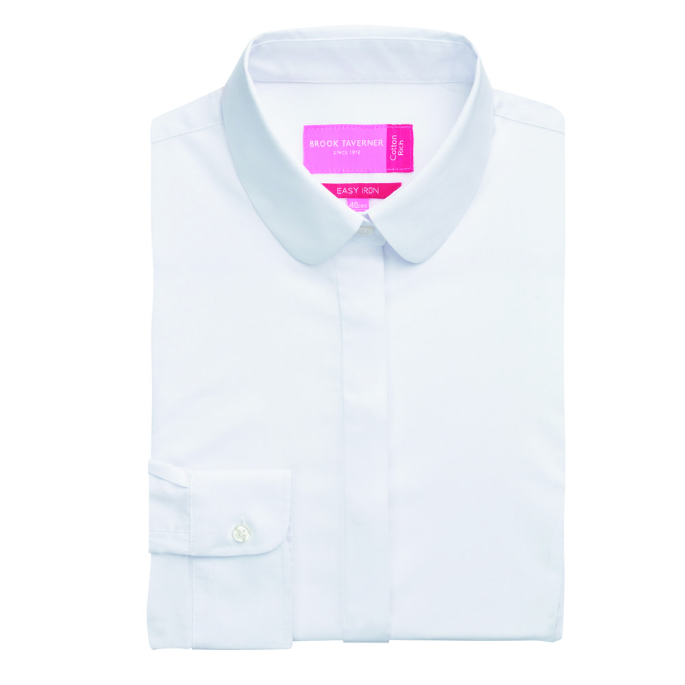 The Brook Taverner Trevi Semi-Fitted Long Sleeve is a semi fitted women’s blouse with contrast white rounded collar, Fly front, single button cuff, Superb stretch fabric, easy to iron.
